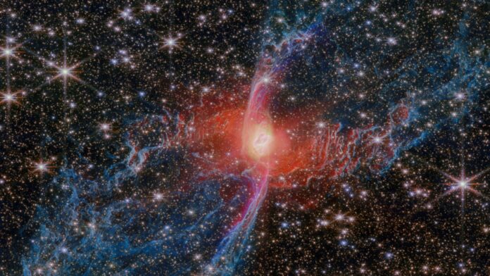 Kosmiczny Teleskop Jamesa Webba (JWST) odsłonił niesamowity obraz mgławicy planetarnej NGC 6537, znanej jako „Czerwony Pająk”. Mgławica, która pojawiła się na zdjęciu wykonanym z kamery w bliskiej podczerwieni (NIRCam), przypomina stworzenie pajęczaka, rozkładające swoje „nogi” z pyłu i gazu wyrzuconego przez umierającą gwiazdę.